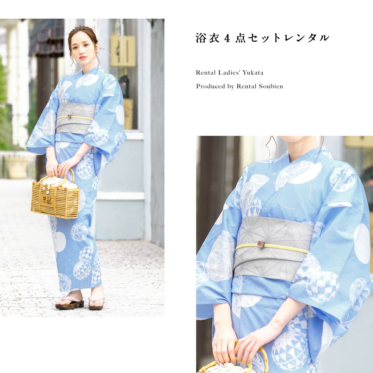 【レンタル】浴衣 セット レディース レトロ 浴衣セット 大人 4点セット 水色 ブルー 金 ラメ 手鞠 輪 モダン 綿 moika モイカ 半幅帯 夏 モダン ゆかた 女性 和服 【往復送料無料】