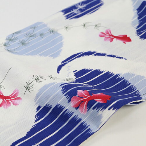 【期間限定クーポンSALE】浴衣 セット レディース レトロ 高級変わり織り綿浴衣3点セット「白地に青の縞水玉模様と金魚」 浴衣 白 金魚 古典柄 大人 しっとり